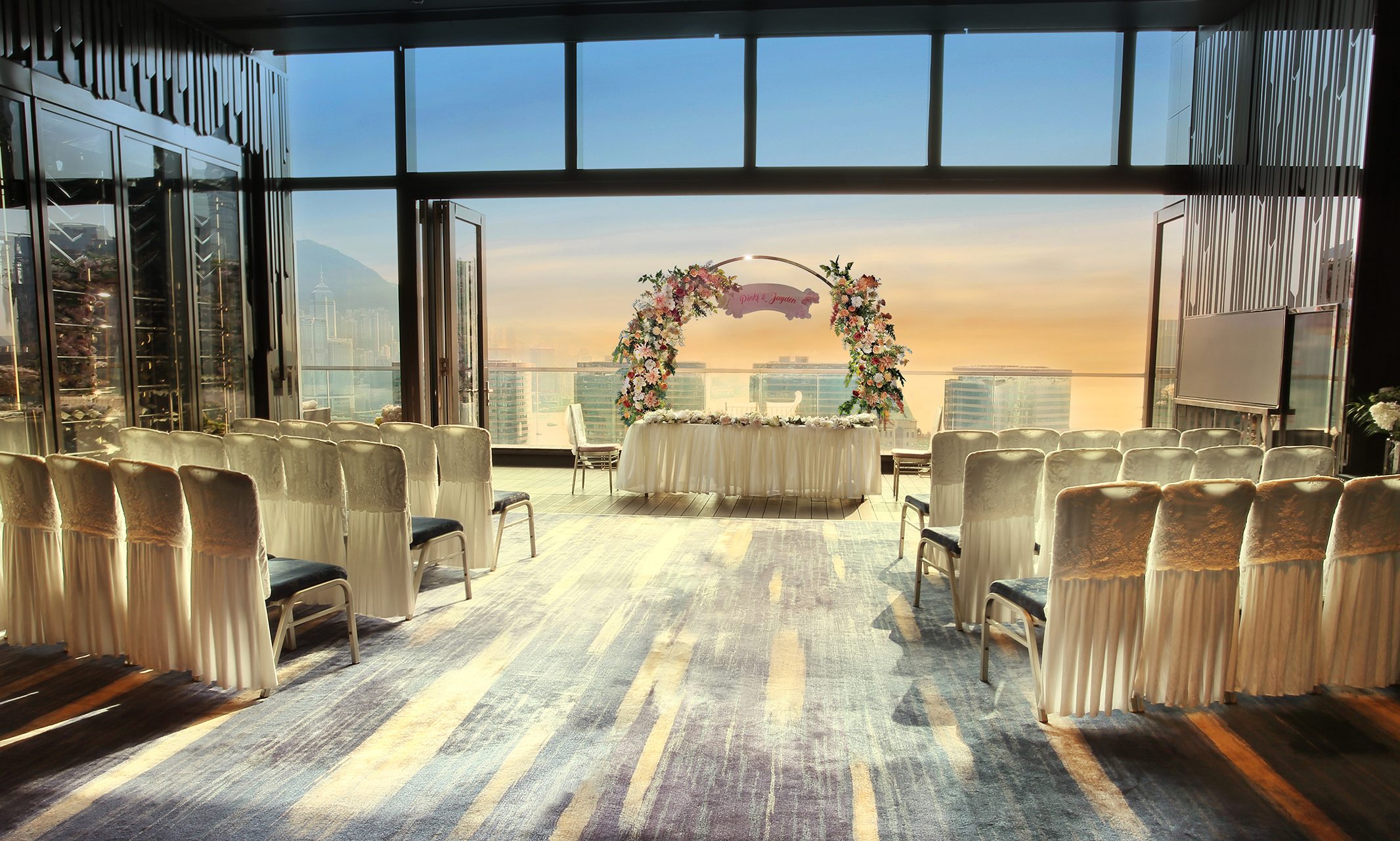 位於尖沙咀繁華地段,擁有 270° 海景露台及開揚景觀落地玻璃,維港醉人景色盡收眼底;別具型格的裝潢、富藝術格調的細節,別出心裁運用不同層次的深色配搭典雅佈置,盡顯高貴時尚氣派;再配備高端投影設備及精緻的婚宴菜色,讓新人享受尊貴華麗的夢幻婚禮。